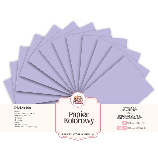 Papier kolorowy A4 Lawendowy pastelowy MaDam Creative to połączenie wysokiej jakości wykonania z pięknym, nasyconym kolorem.
