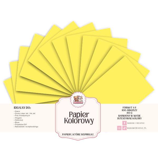 Papier Ksero Kolorowy Żółty pastelowy A4 80g 100 arkuszy, MaDam Creative