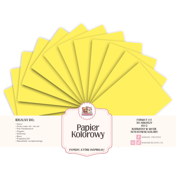 Papier Ksero Kolorowy Żółty pastelowy A4 80g 50 arkuszy, MaDam Creative