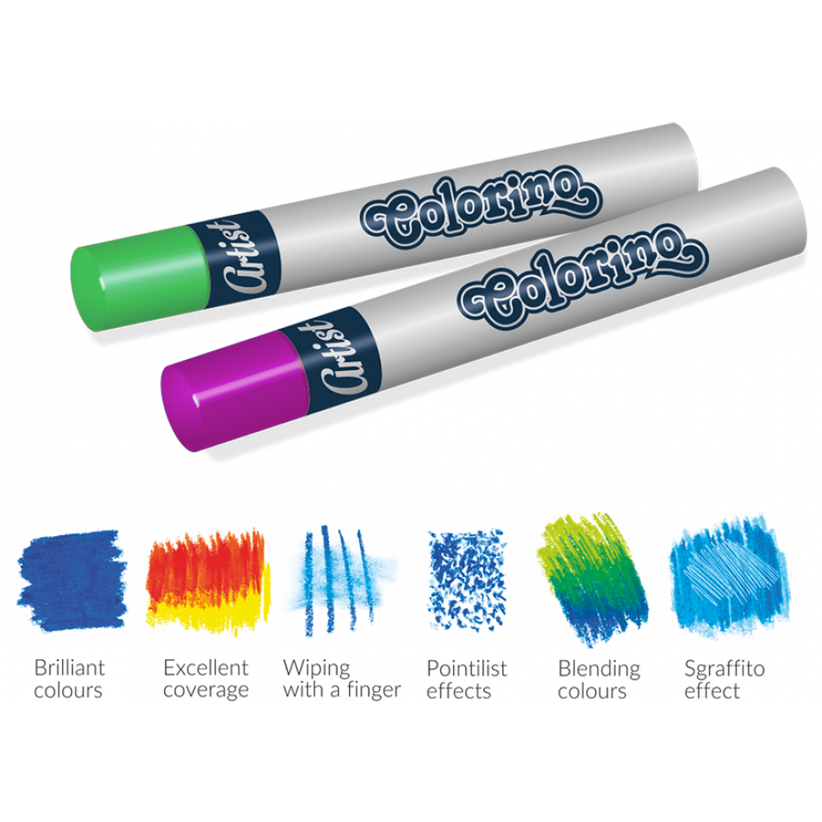 Intensywne i trwałe kolory. Pozwalają uzyskać subtelne efekty cieni i mieszania kolorów. Mogą być używane na sucho oraz na mokro z terpentyną. Dobrze kryjące. Można używać na papierze, kartonie, płótnie.