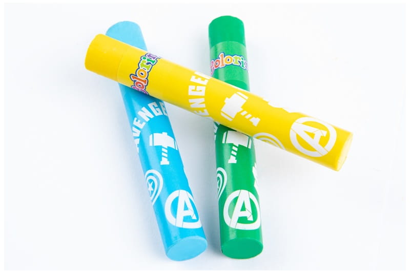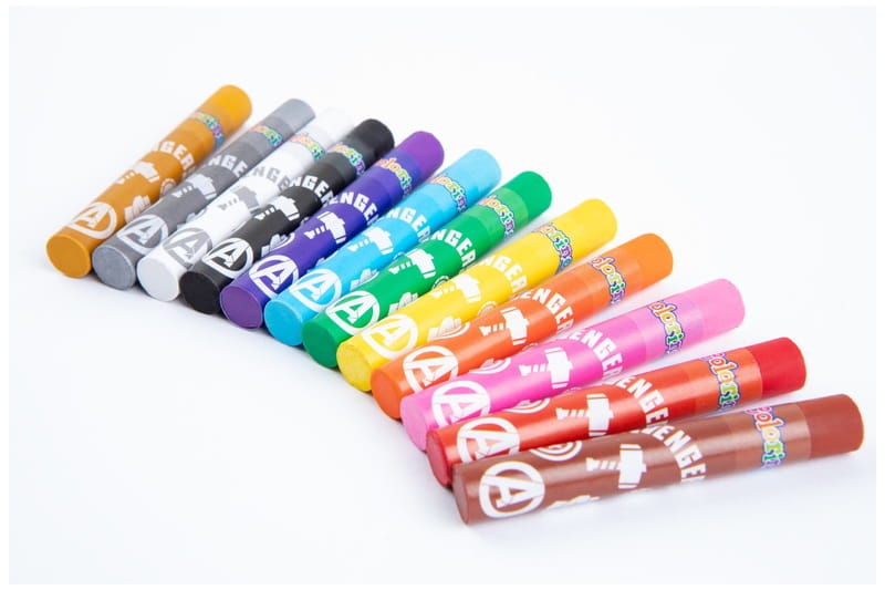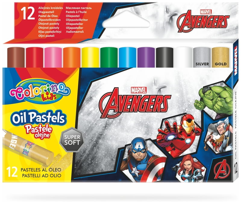Pastele olejne Colorino Avengers o intensywnych i trwałych kolorach. Opakowanie zawiera 12 kolorów. Każda pastela jest owinięta papierkiem z motywem kolekcji, zabezpieczając dłonie przed zabrudzeniem. Pozwalają uzyskać subtelne efekty cieni i mieszania kolorów. Mogą być używane na sucho oraz na mokro z terpentyną. Dobrze kryjące. Można używać na papierze, kartonie, płótnie.
