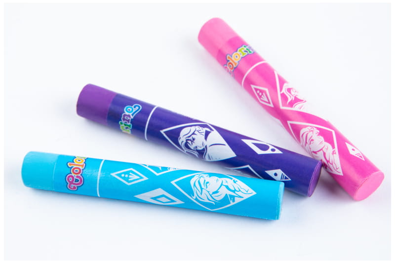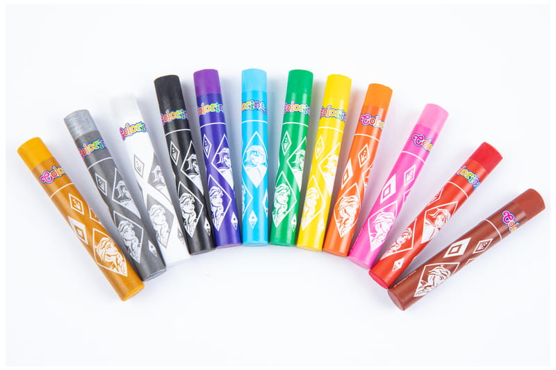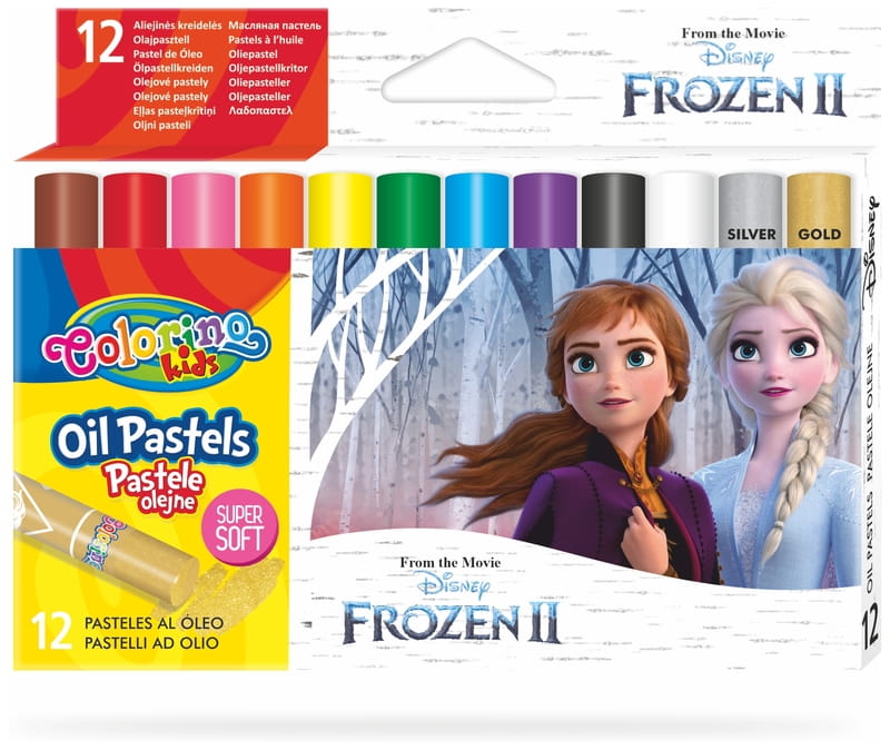 Pastele olejne Colorino Frozen o intensywnych i trwałych kolorach. Opakowanie zawiera 12 kolorów. Każda pastela jest owinięta papierkiem z motywem kolekcji, zabezpieczając dłonie przed zabrudzeniem. Pozwalają uzyskać subtelne efekty cieni i mieszania kolorów. Mogą być używane na sucho oraz na mokro z terpentyną. Dobrze kryjące. Można używać na papierze, kartonie, płótnie.