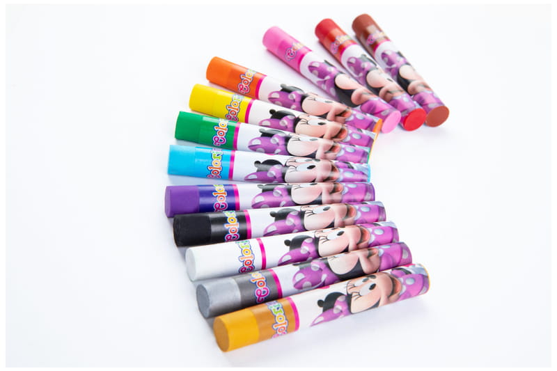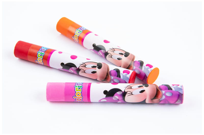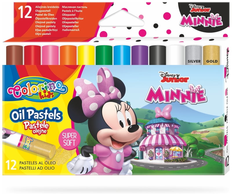 Pastele olejne Colorino Minnie o intensywnych i trwałych kolorach. Opakowanie zawiera 12 kolorów. Każda pastela jest owinięta papierkiem z motywem kolekcji, zabezpieczając dłonie przed zabrudzeniem. Pozwalają uzyskać subtelne efekty cieni i mieszania kolorów. Mogą być używane na sucho oraz na mokro z terpentyną. Dobrze kryjące. Można używać na papierze, kartonie, płótnie.