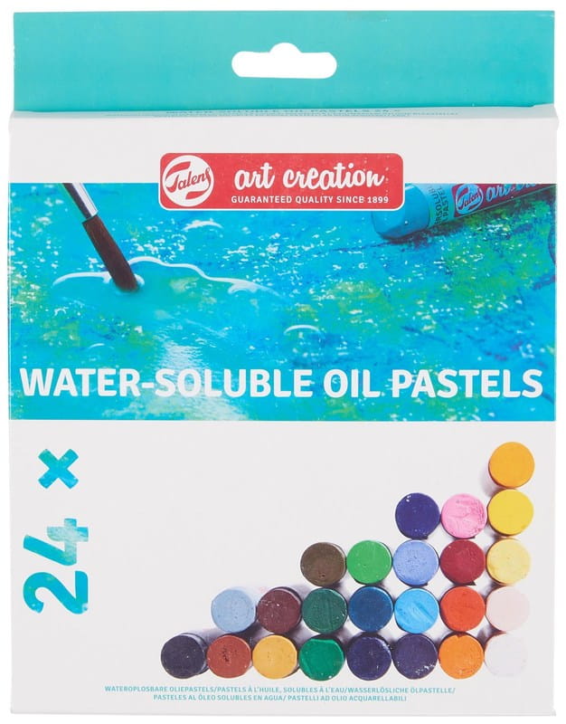 Rozpuszczalne w wodzie pastele olejne Talens Art Creation to kremowe pastele olejne, które gładko się nakładają i łatwo mieszają, tak jak zwykłe pastele olejne. Różnica polega jednak na tym, że oprócz nakładania ich bezpośrednio na papier, pastele te można mieszać z wodą, aby uzyskać jeszcze gładsze przejścia kolorystyczne i nadać intensywnym kolorom większą przejrzystość w celu uzyskania efektu akwareli.