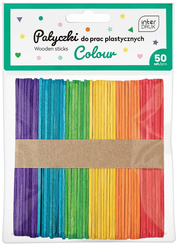 Zestaw 50 sztuk kolorowych patyczków o wymiarach 113x10 mm. Idealne do nauki liczenia, tworzenia tematycznych dekoracji, wszelkich prac DIY, dekoratorskich i modelarskich, scrapbookingu, przyklejania i malowania.