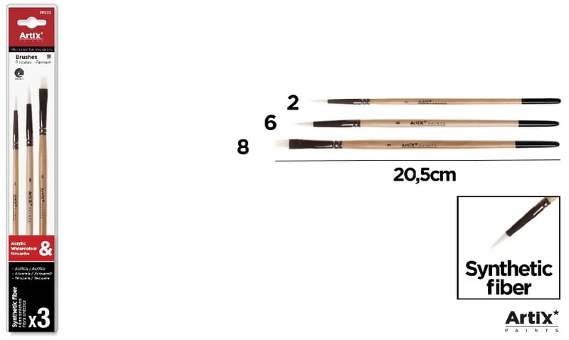 Pędzle syntetyczne zestaw 3 szt. okrągłe nr 2, 6 i płaski nr 8 Artix, Main Paper