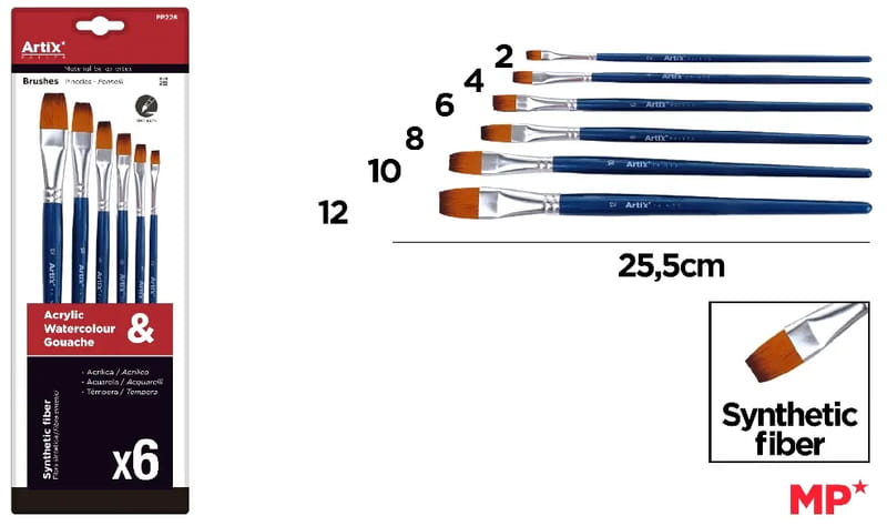 Pędzle syntetyczne zestaw 6 szt. płaskie nr 2 4 6 8, 10, 12 Artix, 519088, Main Paper