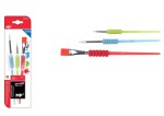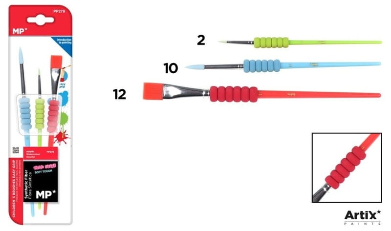 Pędzel dla dzieci z zabawnym uchwytem z syntetycznej pianki, który ułatwia maluchom chwyt i pozwala na bezproblemowe malowanie. Trzy rodzaje pędzli: płaski, cienki i średni. Bardzo miękkie i wytrzymałe włosie syntetyczne.