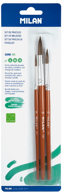 Zestaw 3 szkolnych okrągłych pędzli nr 6, 10, 14 serii 101 z krótkim drewnianym trzonkiem. Skład: 70% naturalnego włosia koziego + 30% syntetycznego. Bardzo miękkie włosie idealne do akwareli, technik wodnych i farb plakatowych. Lepsze zatrzymanie wody i farby. Gładsza linia. Lepsza odporność i elastyczność, co ułatwia odzyskanie kształtu po jego użyciu. Brązowe lakierowane wykończenie i aluminiowa skuwka bez spawania, odporna na rdzewienie. Wymiary: 26,4 x 8,4 x 1 cm. 3 sztuki na blistrze.