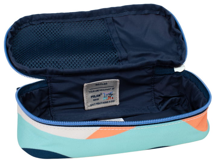 Piórnik owalny z kolekcji THE FUN, niebieski. Zapinany na suwak. W środku dodatkowa kieszonka z siatki. Kolekcja THE FUN jest inspirowana zabawą i radością podczas procesu twórczego. Dzięki unikalnej palecie kolorów, różne kształty kolażu stają się nadrukiem tej kolekcji. Materiał zewnętrzny i wewnętrzny 100% poliester. Rozmiar: 20,5 x 9 x 5,5 cm.