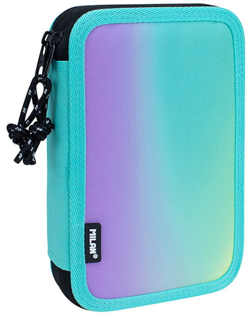 Piónik 2 - poziomowy z wyposażeniem z kolekcji SUNSET w kolorze zielonym. Połączenie gradientowych kolorów inspirowanych zachodem słońca z czarno-białymi detalami. Zamek błyskawiczny z cięciwą. Wyposażenie: 12 kredek trójkątnych, 18 flamastrów ze stożkową końcówką, długopis COMPACT SUNSET niebieski, ołówek sześciokątny HB, linijka trójkątna 15 cm, temperówka kwadratowa AFILA, 2 gumki 4024 i 320SN. Każdy poziom osobno zapinany na suwak. Przy produkcji piórników użyto najlepszych materiałów, bardzo wytrzymałych suwaków oraz wzmocnionych nici. Niepowtarzalne wzornictwo. W piórnikach znajdziesz min.: kredki MILAN przy produkcji których użyto drewna pochodzącego wyłącznie z plantacji, gwarantujących nie używanie drewna z lasów deszczowych. Rysik kredki na całej długości jest przyklejony do drewna co zapobiega jego łamaniu.