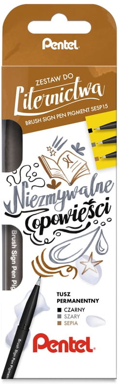 Pisaki pędzelkowe zestaw do liternictwa Brush Sign Pen 3 sztuki Niezmywalne Opowieści, Pentel