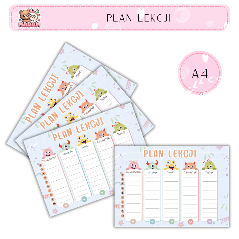 Hokus Pokus i Porządek! – Z naszym planem lekcji, każde dziecko będzie wiedziało, co, gdzie i kiedy! Magiczne kolory i urocze postacie sprawią, że planowanie tygodnia stanie się zabawą. Może nawet uda się odczarować niechęć do porannego wstawania... Ale nie obiecujemy cudów!