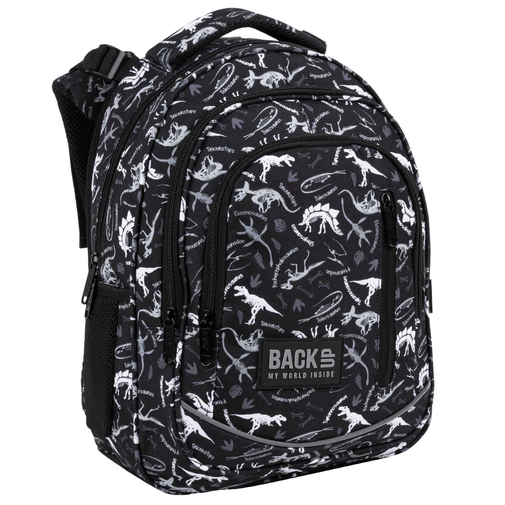 Wykopaliska, szkielety dinozaurów, komary zachowane w bursztynie, pradawne rośliny. Niezwykle fascynujący świat skamielin nie ma przed Tobą tajemnic, mógłbyś zawstydzić niejednego paleontologa. Skomplikowane nazwy jak triceratops, stegosaurus, pachycephalosaurus, pteranodon, elasmosaurus nie brzmią wcale tajemniczo. Szacuneczek Mamy w takim razie propozycję, przyjrzyj się tym szkieletom. Myślisz, że wszystko się zgadza Sprawdź nas Odcienie czerni, szarości i bieli to doskonała propozycja dla każdego chłopca zafascynowanego światem wymarłych gadów. Plecak BackUP posiada