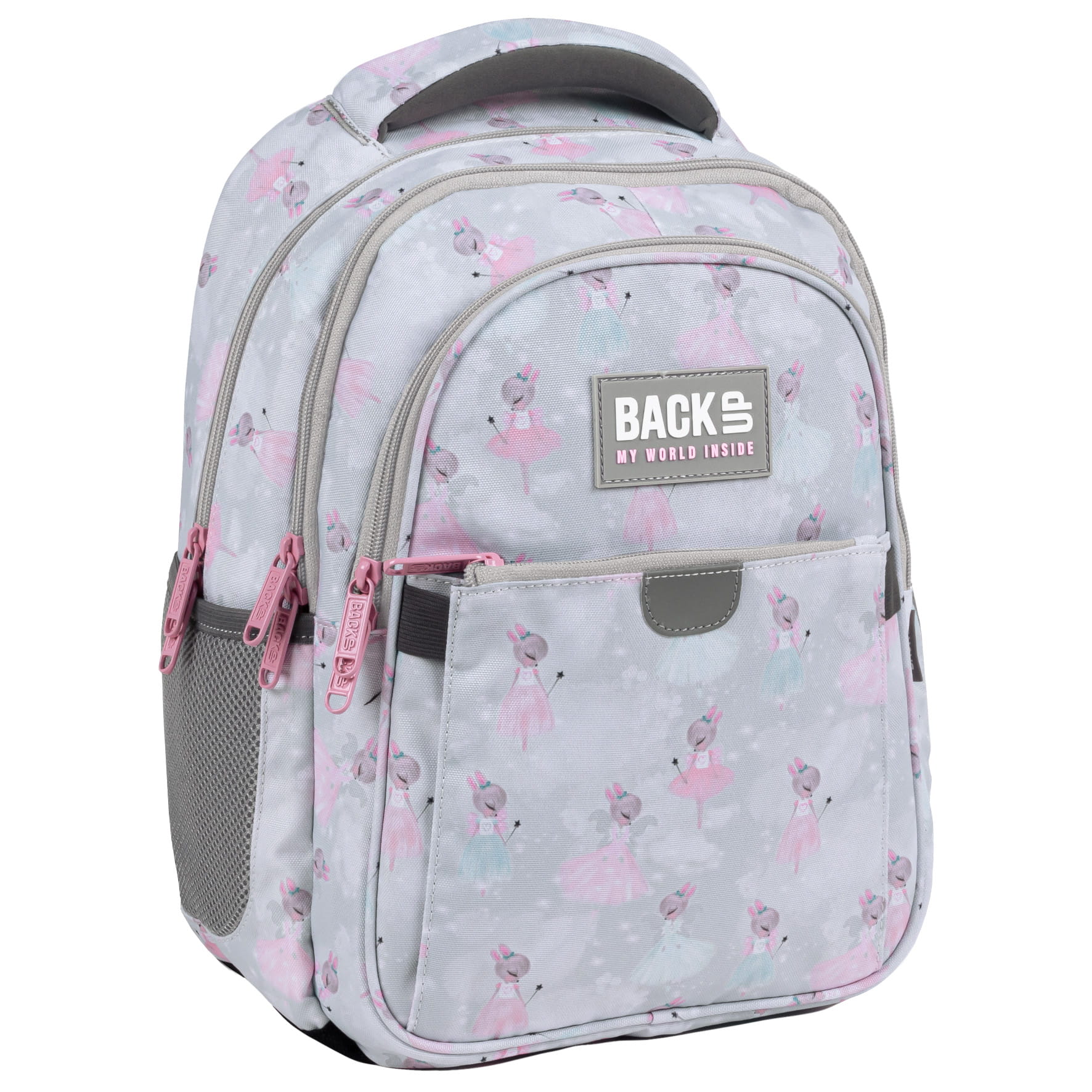 Fantazyjny świat, gdzie szum wody spadającej w dół z wodospadu delikatnie wypełnia okolicę, dookoła bujne drzewa i kwitnące kwiaty. Spoglądasz w górę i zostajesz oczarowany widokiem przepięknej tęczy. W tej magicznej krainie żyją wróżki króliczki. Ich delikatne, tiulowe sukienki pobłyskują w słońcu, a w rączkach migoczą czarodziejskie różdżki. Wzór w delikatnych kolorach szarości, błękitu i różu stworzony dla marzycielek i małych księżniczek. Plecak BackUP posiada