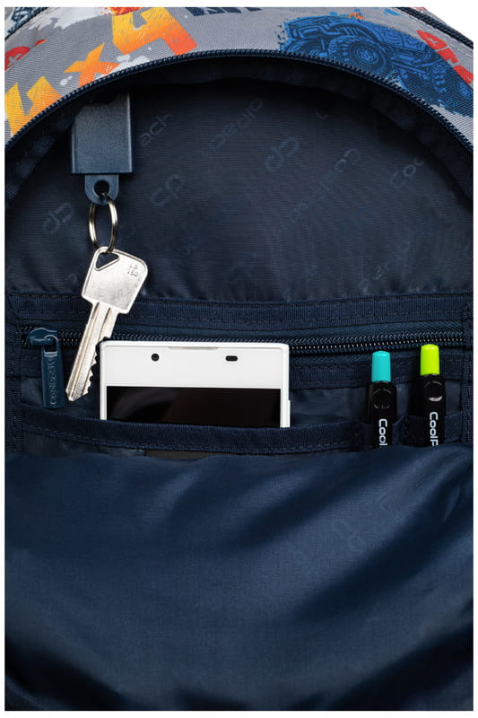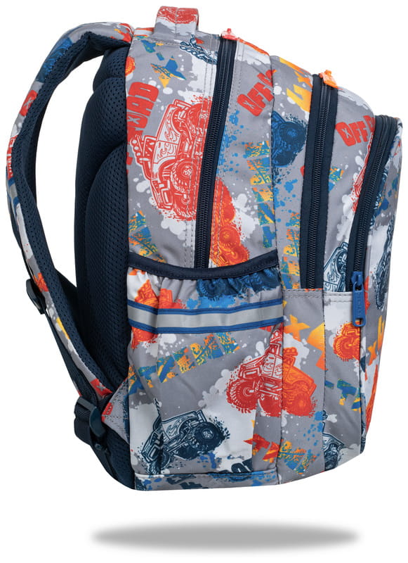 Zawiera dwie komory główne, przednią kieszeń oraz dwie siatkowane kieszonki po bokach np. na bidon. Plecak posiada wewnętrzny organizer, dzięki któremu potrzebne rzeczy są zawsze pod ręką. Ergonomiczne wykonanie, na które składają się wyprofilowane, usztywnione plecy, wyściełane szelki na ramiona oraz spinany pas piersiowy sprawiają, że jest to zdrowy i wygodny plecak do szkoły. Plecy wykonane są z paneli anatomicznych z miękkiej gąbki pokrytych oddychającą siateczką - komfort i podparcie kręgosłupa. Dodatkową zaletą plecaka Jerry jest wzmocniony spód plecaka, chroniący przed uszkodzeniami. Dla zwiększenia bezpieczeństwa plecak posiada odblaski.