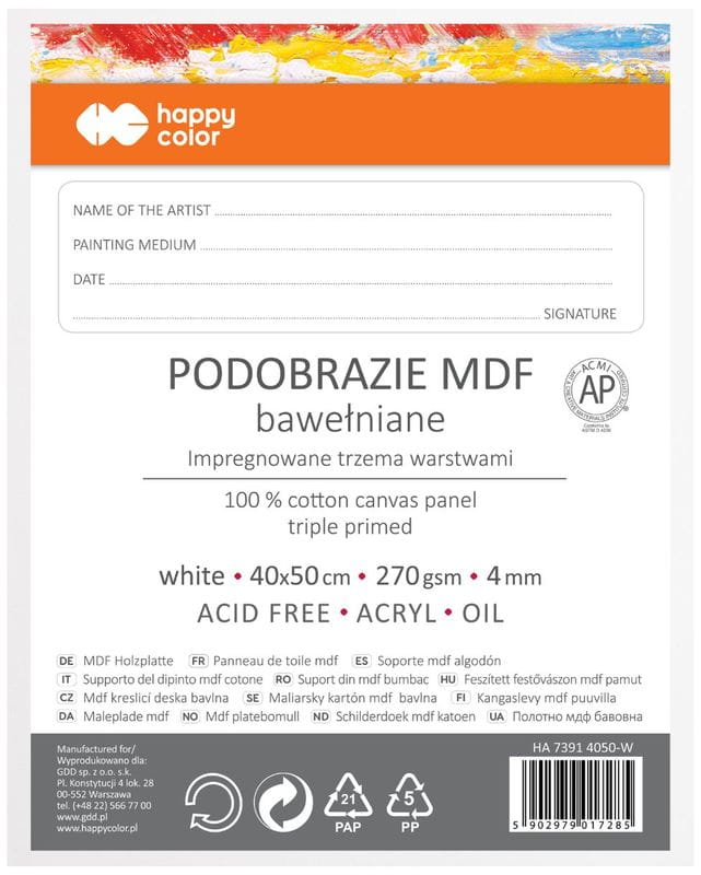 Podobrazie bawełniane impregnowane białe 40x50, MDF 4mm, Happy Color