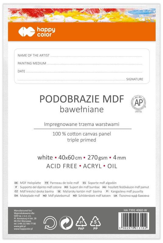 Podobrazie bawełniane impregnowane białe 40x60, MDF 4mm, Happy Color