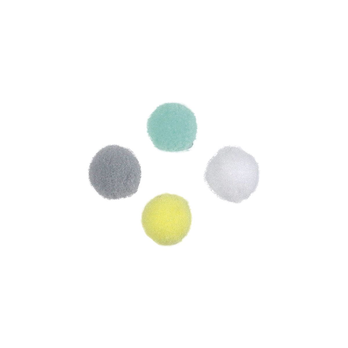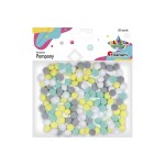 Pompony poliestrowe. Tonacja pastelowa, kolory: biały, żółty, szary, turkus. Średnica: 10 mm. 120 sztuk.