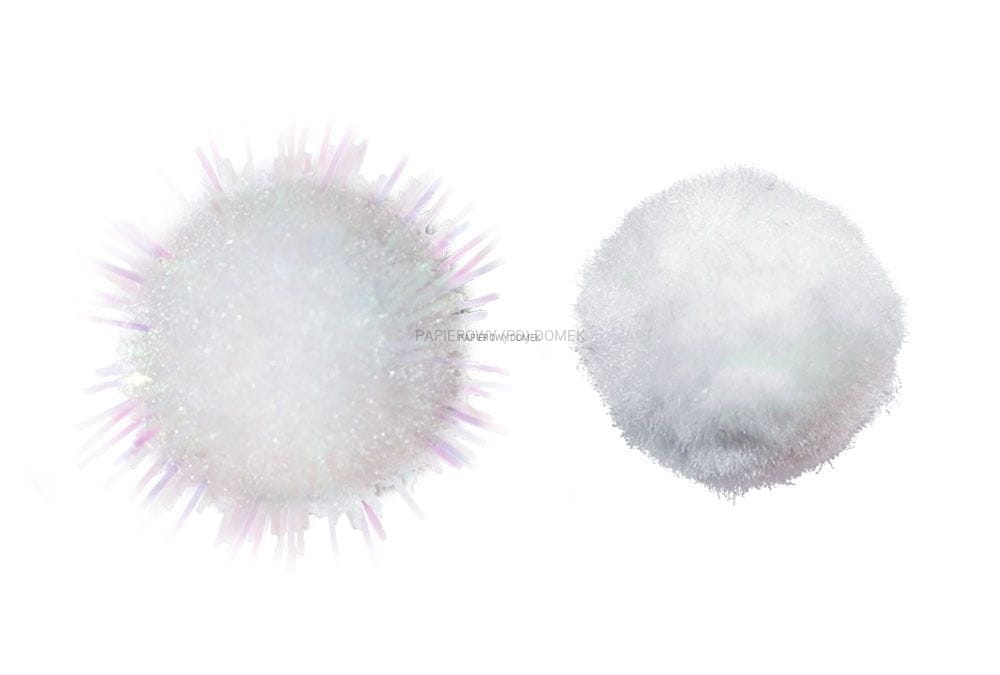 - pompony akrylowe - kolor: białe brokatowe i matowe - średnica: miks - 85 szt