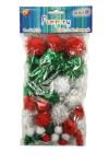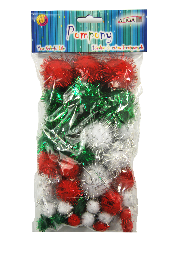 Pompony z brokatem. Opakowanie zawiera 50szt. mixów, o wymiarach : 1,5 cm. średn. – 24 szt. – biały, czerwony, zielony po 8 szt. 2,5 cm. średn. – 17 szt. – kolory jw. – mix losowo 3,8 cm. średn. – 9 szt. – kolory jw. po 3 szt.