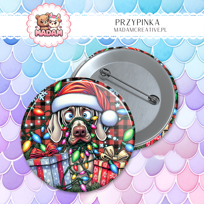 Przypinka 58mm MaDam Piesek w czapce i świątecznych lampkach – W świątecznym blasku piesek zawsze błyszczy!