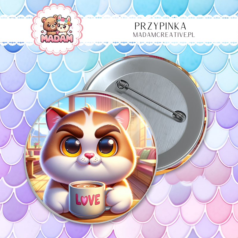 Przypinka 58mm MaDam Przypinka Kot z kubkiem 'Love– Taki słodki, że aż chce się przytulić! Albo podkraść łyk herbaty…
