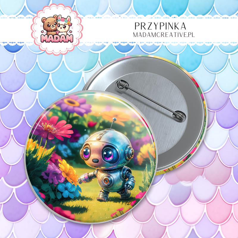 Przypinka 58mm MaDam Przypinka Mały robocik na łące – Technologia spotyka naturę! Pamiętaj: podlej olejem!