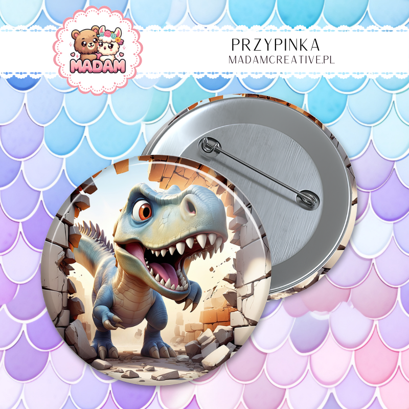 Przypinka 58mm MaDam T-Rex w akcji – Przyjaciel z epoki dinozaurów… ale zawsze w gotowości do zabawy!