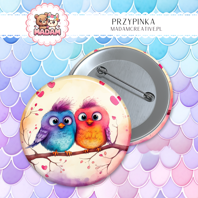Przypinka 58mm MaDam Zakochane ptaszki – Idealne na randki lub do wyrażenia miłości... do jedzenia!