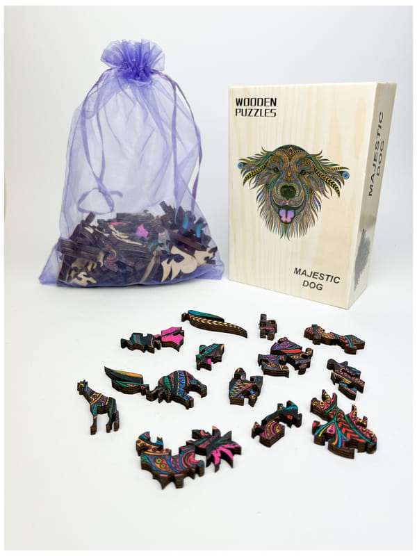 W pięknym pudełku znajduje się elegancki woreczek z puzzlami oraz duże zdjęcie obrazu, który należy ułożyć. Oprócz nietuzinkowego wyglądu, drewniane puzzle gwarantują świetną zabawę i aktywują nasz mózg.