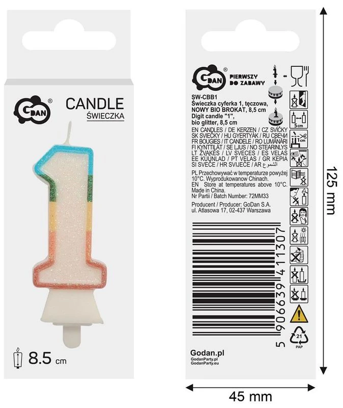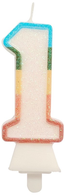 Świeczka cyferka 1, tęczowa, brokat BIO, 8,5 cm, GoDan
