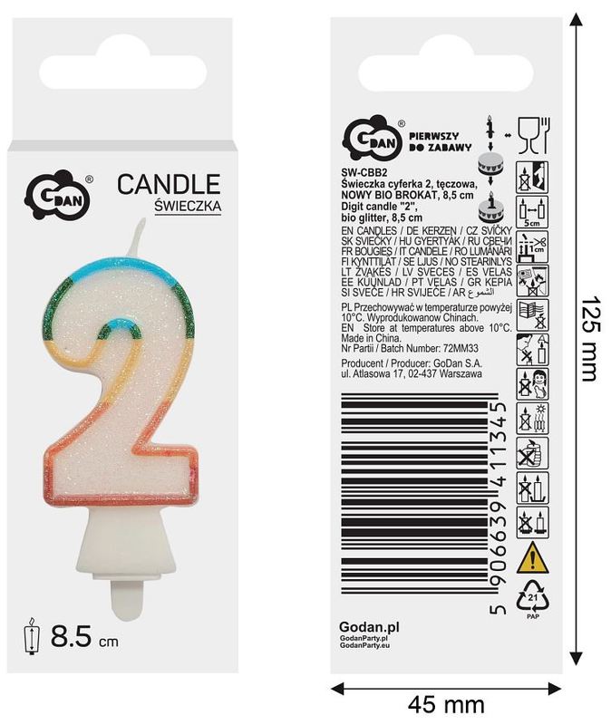 Świeczka cyferka 2, tęczowa, brokat BIO, 8,5 cm, GoDan