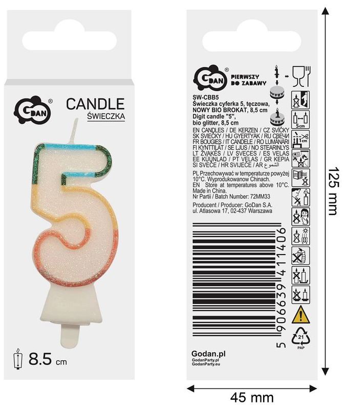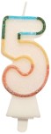 Świeczka cyferka 5, tęczowa, brokat BIO, 8,5 cm, GoDan