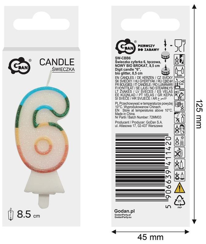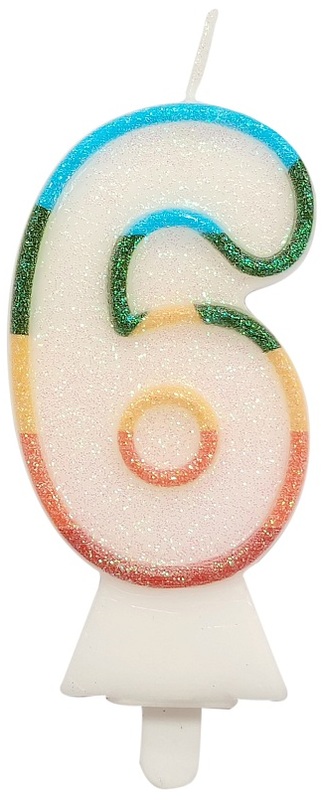 Świeczka cyferka 6, tęczowa, brokat BIO, 8,5 cm, GoDan