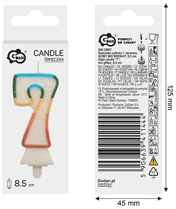 Świeczka cyferka 7, tęczowa, brokat BIO, 8,5 cm, GoDan