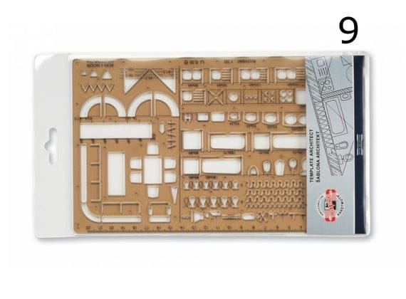 Szablon architektoniczny wykonany jest z dymionego tworzywa sztucznego. Jest przydatny przy projektowaniu. Zawiera podzielone na grupy symbole: umeblowania, wyposażenia kuchni, instalacji sanitarnych, instalacji elektrycznej, izolacji, otworów drzwiowych, poziomu i kierunku.