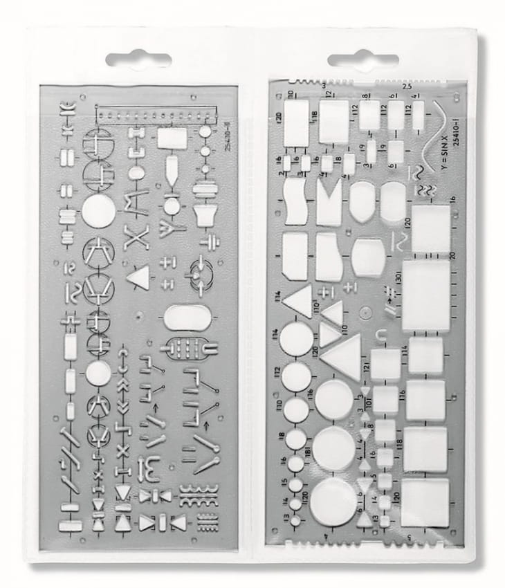 Szablon wykonany jest z dymionego tworzywa sztucznego. Umożliwia precyzyjne rysowanie schematów elektrycznych. Posiada wypustki zapobiegające rozmazywaniu się rysunku przy przesuwaniu szablonu.