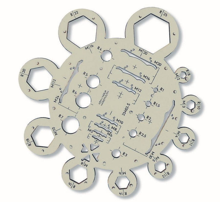 Szablon techniczny wykonany jest z dymionego tworzywa sztucznego. Jest niezwykle pomocny przy rysowaniu śrub w bardzo szerokim zakresie wymiarów metrycznych. Posiada specjalne wypustki, które zapobiegają rozmazywaniu się rysunku przy przesuwaniu szablonu.