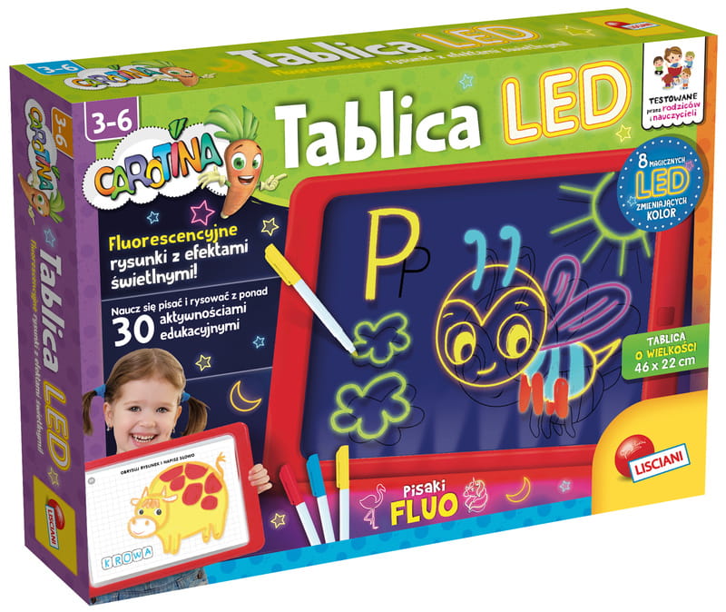 Świecąca, fluorescencyjna tablica, dzięki której rysunki dziecka są widoczne w ciemności. 8 różnych trybów podświetlenia. Przy użyciu fluorescencyjnych pisaków można rysować nieskończenie wiele razy, zmazując rysunki suchą ściereczką. Wszechstronna jak klasyczna tablica i świecąca jak neonowy szyld! Zawartość: szablony rysunków, pisaki, wsporniki do używania tablicy w pionie, tablica led, 8 trybów podświetlenia.