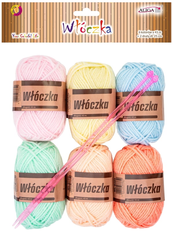 Włóczka pastelowa zestaw 6 kolorów x 43m + 2 druty 25 cm, Aliga