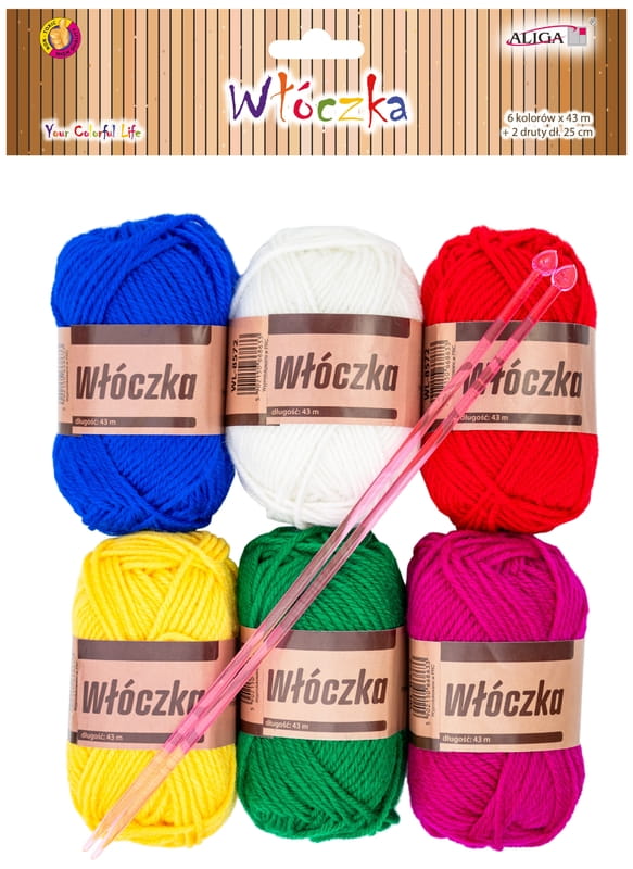 Włóczka zestaw 6 kolorów x 43m + 2 druty 25 cm, Aliga