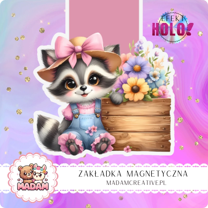 Zakładka Magnetyczna Holograficzna MaDam Szopka Sara – Z kwiatkiem w łapkach i tajemniczym uśmiechem, gotowa na czytelniczą przygodę!