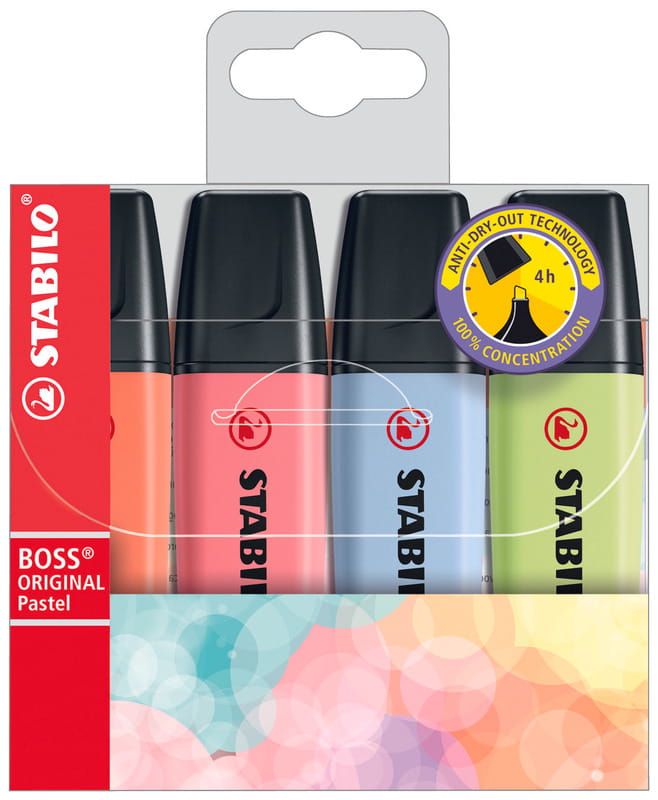STABILO BOSS ORIGINAL to kultowy neonowy zakreślacz już od 1971 roku. Jego paleta barw poszerza się teraz jeszcze bardziej za sprawą wprowadzenia 6 subtelnych, ale stylowych odcieni: mlecznej żółci, kremowej brzoskwini, szczypty mięty, promiennego różu, fioletowej mgiełki i muśnięcia turkusu. To zakreślacz dla wszystkich tych, którzy preferują miękkie i kremowe odcienie zamiast jasnych, mieniących się w oczach kolorów. BOSS ORIGINAL Pastel to jednak coś więcej niż zakreślacz - to modny dodatek, który pozwoli Ci wyrazić swoją osobowość. Oferuje naszą zwyczajową wysoką jakość, technologię STABILO Anti-Dry-Out (nawet do 4 godzin) i tusz na bazie wody, dzięki czemu idealnie sprawdza się w szkole, na studiach, w pracy lub jako narzędzie podczas realizowania swojego hobby. Przy okazji: nasza pastelowa kolekcja obejmuje także kultowe cienkopisy STABILO point 88, flamastry STABILO Pen 68 oraz cienkopisy STABILO pointMax. Wyróżnij się z tłumu!