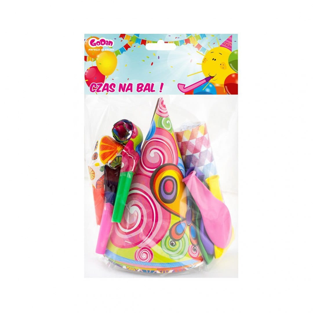 Zestaw "Bal duży" (4 czapeczki, 4 trąbki, 4 balony,1 rolka serpentyny)