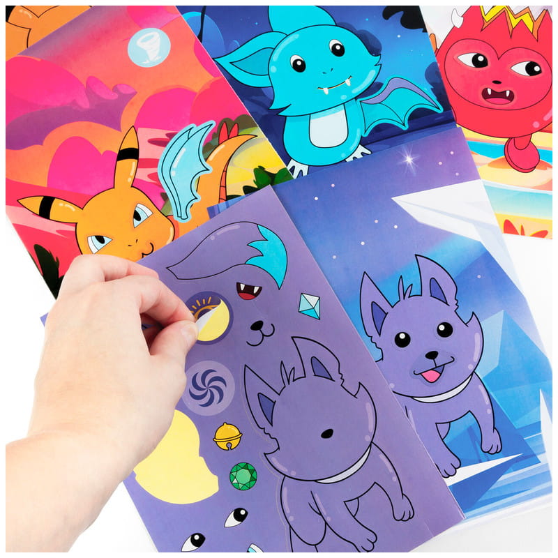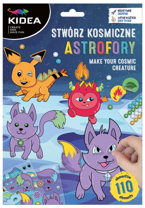 Stwórz kosmiczne astrofory. Astrofory to małe istoty kosmiczne, pokryte puszystym futrem, które świeci w różnych kolorach, pokazując ich emocje. Potrafią wykonywać magiczne sztuczki dzięki użyciu energii kosmicznej. Zazwyczaj mieszkają na asteroidach, ale czasami bawią się na statkach kosmicznych i robią psikusy. Są przyjazne wobec obcych, chociaż mogą być nieco psotliwe. Zestaw zawiera 4 różne wzory podkładów po 2 szt. każdy oraz 4 zestawy naklejek do dekoracji astroforów. Do kompletu zostały dodane także diamenciki w 4 kolorach.