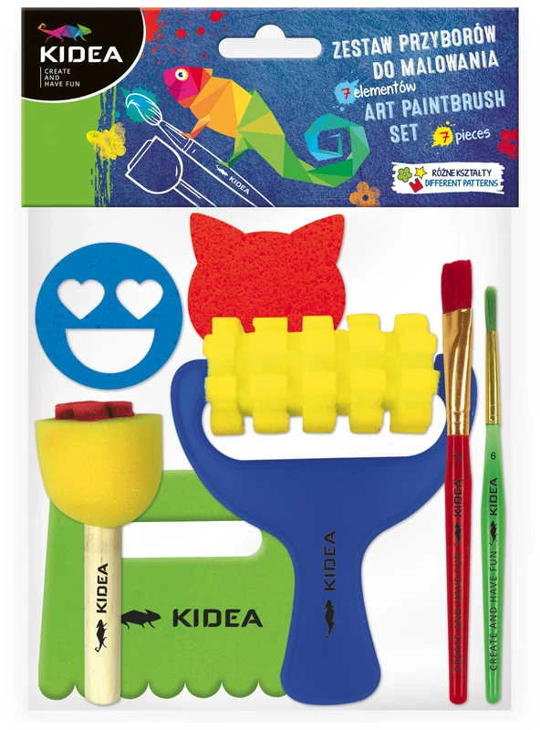 Praktyczny zestaw do malowania farbami, który gwarantuje wspaniałą zabawę. W skład zestawu wchodzą 2 pędzle: płaski do wypełniania większych powierzchni oraz drugi do malowania elementów wymagających większej precyzji. Dodatkowo w komplecie znajdziemy wałek, szeroki pędzel gąbkowy, stempelek - motylek z drewnianą rączką, oraz dwa kolorowe stempelki gąbkowe w kształcie motylka i kwiatka.