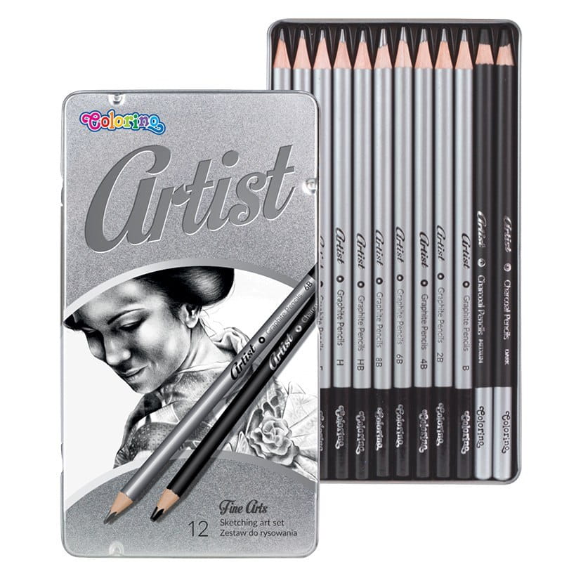 Zestaw do rysowania w metalowym pudełku Colorino 12 elementów ółówki + węgiel