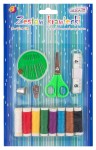 Zestaw krawiecki zawierający: igły, nici, nawlekacz, naparstek, nożyczki, miarkę.
