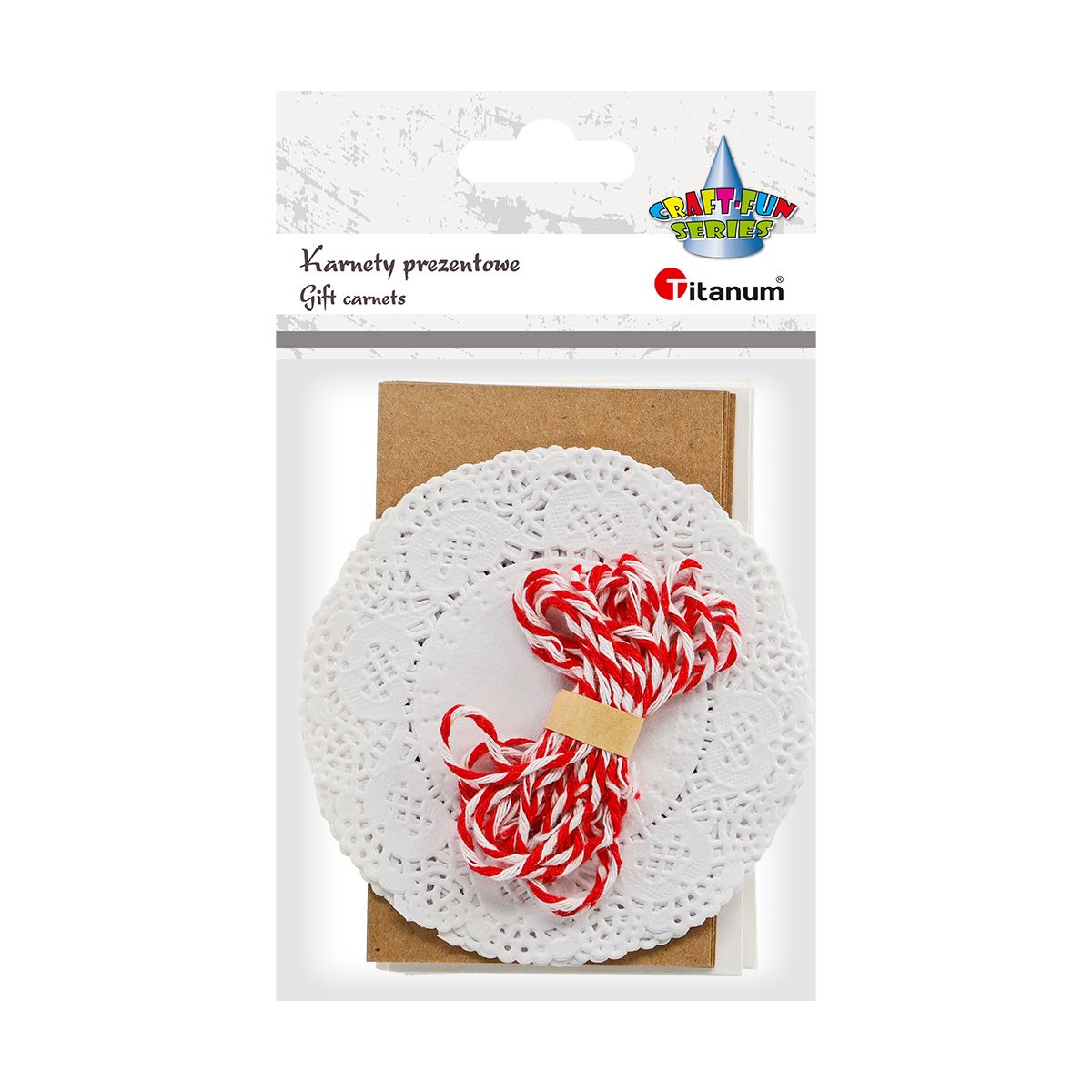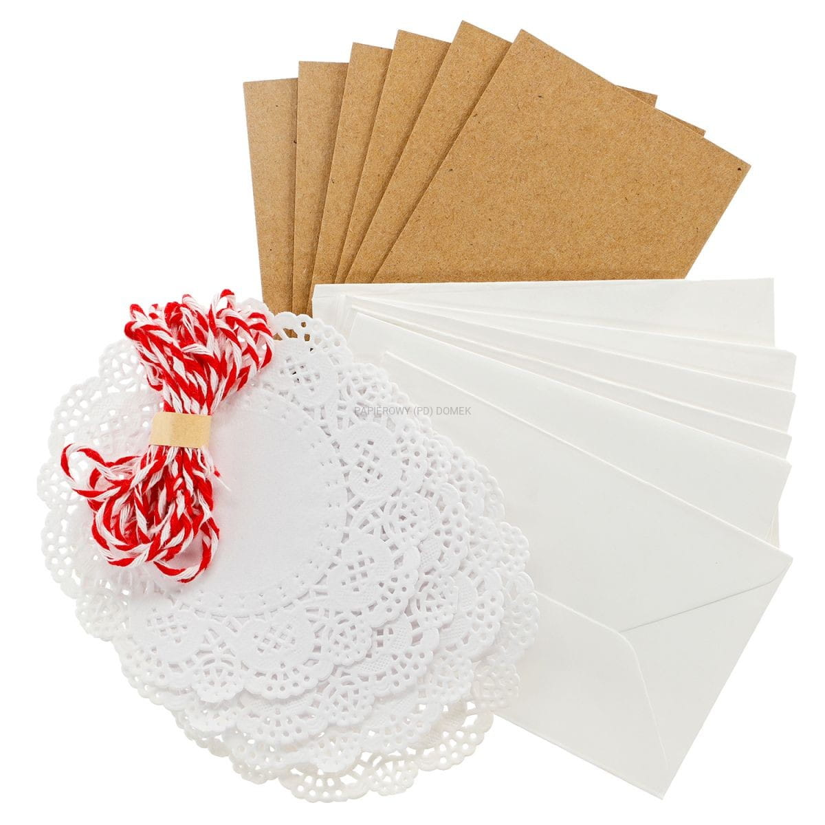 - W skład zestawu wchodzi 6 kartonowych karnetów 100 x 60 mm, 6 białych kopert 60 x 112 mm, 6 białych papierowych serwetek o średnicy 90 mm oraz bawełniany sznurek o długości 190 cm.